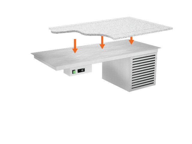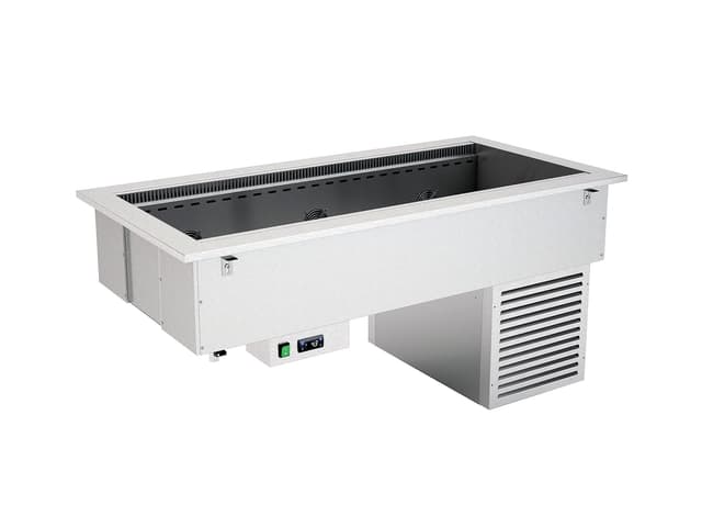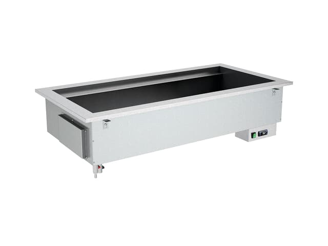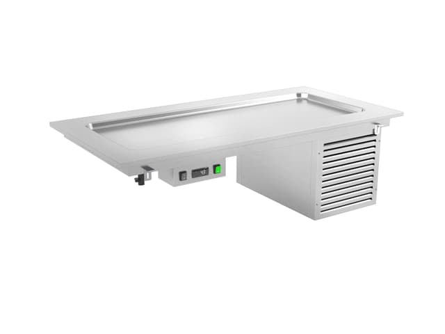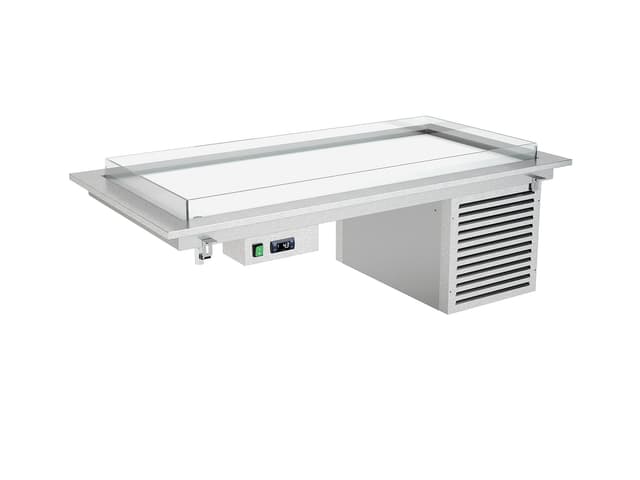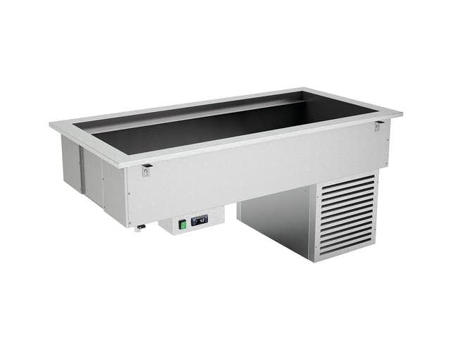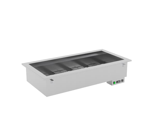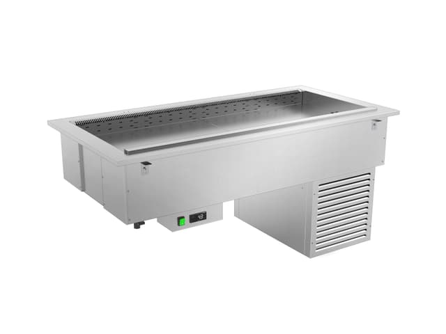 Todos los módulos DROP-IN están disponibles en tamaños de 3 a 5 GN 1/1. Los módulos básicos con refrigeración estática (R) y agua de baño (BM) también están disponibles en el tamaño 2 GN 1/1. Cada módulo puede estar compuesto únicamente por la bañera/top o estar equipado con cubiertas superiores con iluminación led. Los módulos calentados y neutros pueden equiparse también con lámparas calentadoras halógenas (opt. HALO) o iluminación led + lámparas calóricas halógenas (opt. HALOLED). Para la máxima higiene y seguridad se pueden elegir tres tipos diferentes de protección para completar la parte superior; Opción G1: protección contra estornudos recto en vidrio templado, Opción G2: protección contra estornudos inclinada en vidrio templado, Opción G3: cierre completo del lado de servicio con vidrio templado. Los módulos BM están equipados con un sistema de llenado de agua de pozo (no automático).