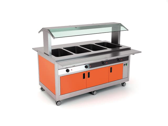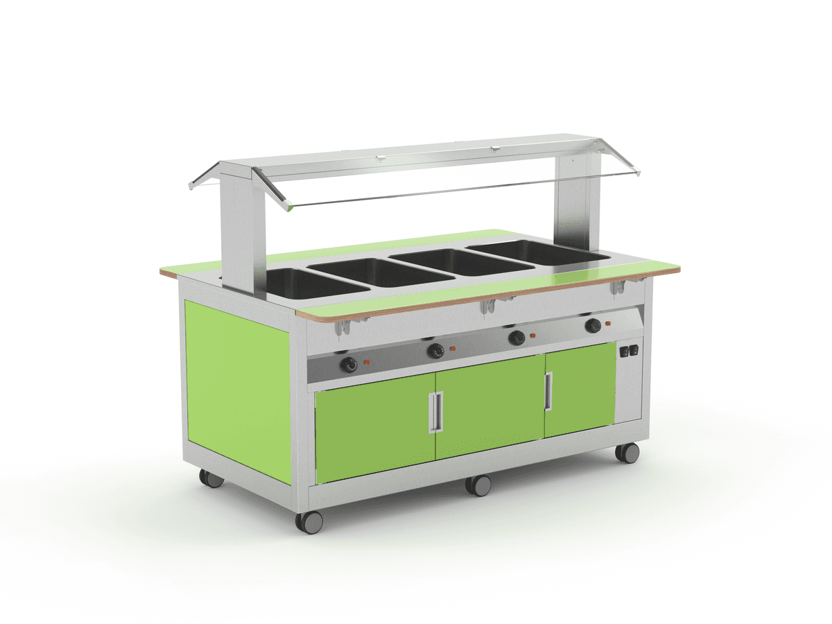 Al igual que la línea OMNIA, los módulos de la gama KIDS son totalmente configurables. Cada unidad se puede completar con bandejas de varios materiales, con superestructuras equipadas con iluminación led (opt.LED) o, para los módulos cálidos y neutros, con lámparas halógenas calefactoras (opt.HALO). Para garantizar la máxima seguridad e higiene, por último, cada módulo puede completarse con un parapeto de vidrio templado recto, inclinado o bien con un cierre total del lado cliente para la máxima seguridad y servicio con operario. Todos los modelos pueden ser revestidos con diferentes materiales para satisfacer diferentes gustos y necesidades. Acero inoxidable, madera laminada disponible en 16 colores diferentes o chapa pintada con polvo son las opciones entre las cuales el cliente puede realmente construir su propia líneaservicio para niños; sin olvidar la posibilidad de añadir varias opciones para satisfacer cualquier necesidad de uso.
