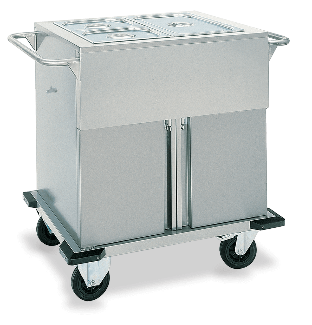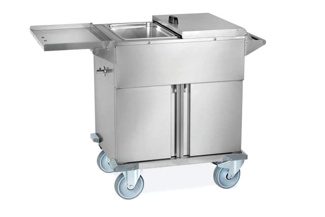 Carros térmicos racionales y resistentes de acero inoxidable con capacidad 2 o 3 GN1/1 según el modelo. Bañera con aislamiento de doble pared para un perfecto mantenimiento de la temperatura. Calentamiento mediante resistencias eléctricas de inmersión (CAPRICORNIO) o a seco (TORO) con termostato mecánico (+30°/+90°C) y luz indicadora de funcionamiento. 4 Parachoques antihuellas y dos ruedas con freno de serie. Los modelos TORO están equipados con tapas que se abren a 180° y puertas inferiores que se abren a 270°, el compartimento inferior puede calentarse bajo petición (opt.R) y está equipado con guías extraíbles para la instalación de depósitos GN. (opt. ESTR).