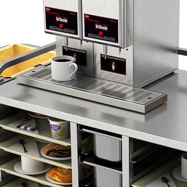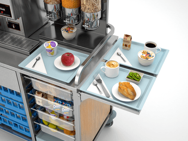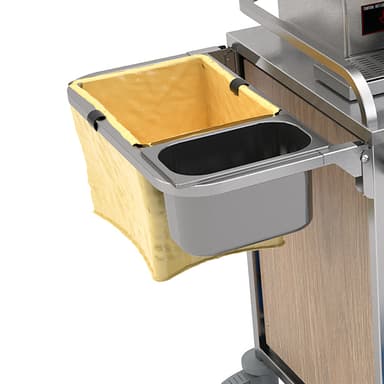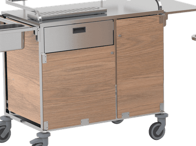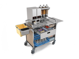 Nuevo carro diseñado y construido para una fácil distribución de desayunos y comidas directamente en el carril. Su estructura permite adaptarlo fácilmente a las necesidades de diferentes estructuras y satisfacer los más diversos usos. El carro está equipado de serie con un práctico cajón que puede alojar contenedores GN. Equipado con ruedas giratorias Ø125mm, 2 de ellas con freno. No se incluyen depósitos GN ni cestas de lavavajillas. Las puertas pueden abrirse con un ángulo de 270°.