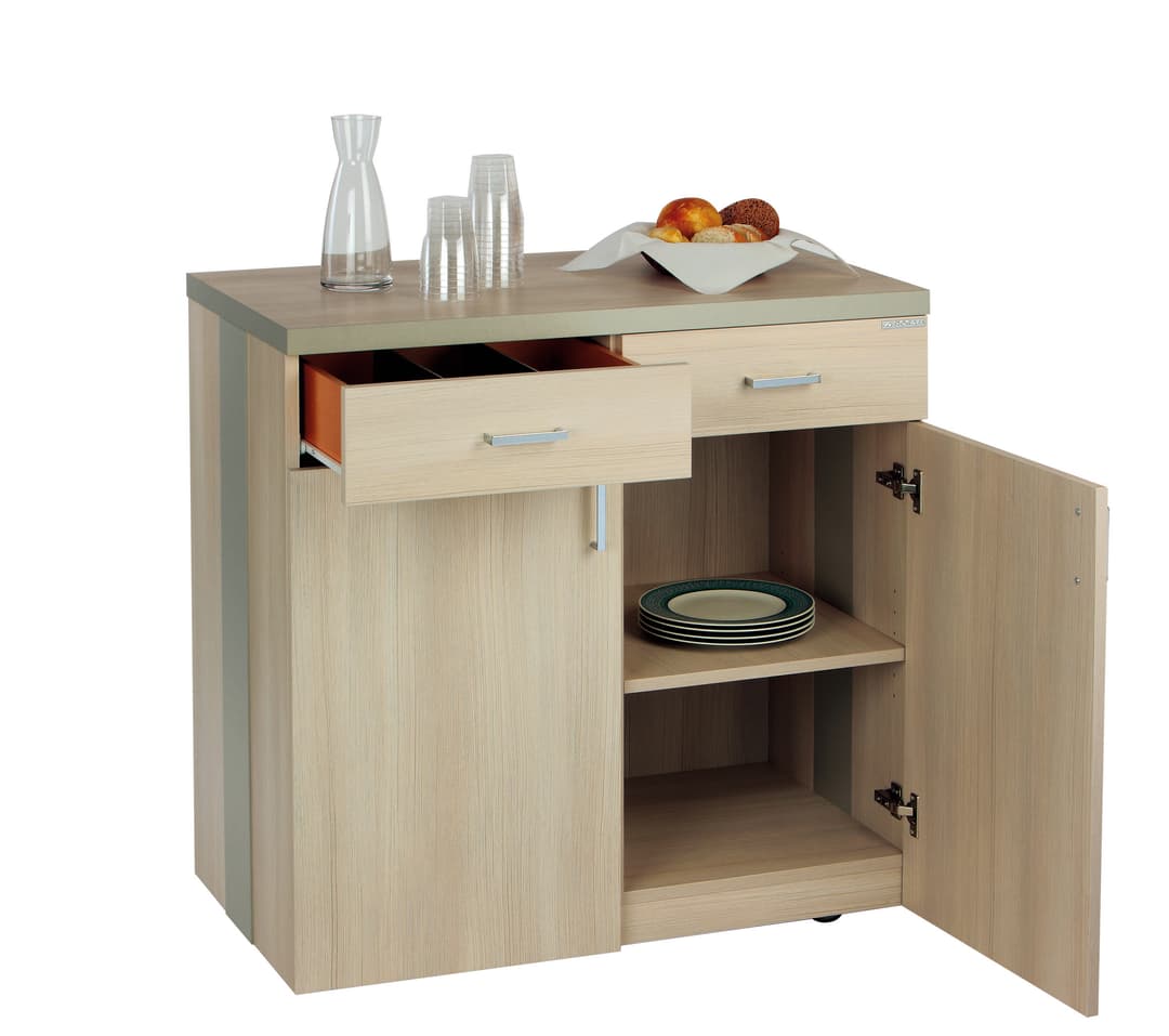 Moderno mobiliario de servicio sobre ruedas en madera laminada con detalles color aluminio. Modelos de 2 o 3 puertas cerradas con cierre lento, con estante interior. En lugar de los cajones se puede disponer de un portacubiertos abierto con 6 compartimentos (opt. PP/F). Los muebles se pueden equipar con una base reforzada con ruedas más grandes (ø125mm) y manija de empuje (B/R). Opcional tolva extraíble sobre guías correderas con bolsa de algodón extraíble y lavable (opt. TR).
