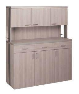 Moderno mobiliario de servicio sobre ruedas en madera laminada con detalles color aluminio. Modelos de 2 o 3 puertas con cierre lento, cerrado con estante interior y parte superior cerrada por puertas. En lugar de los cajones se puede disponer de un portacubiertos abierto con 6 compartimentos (opt. PP/F). Los muebles se pueden equipar con una base reforzada con ruedas más grandes (ø125mm) y manija de empuje (B/R). Opcional tolva extraíble sobre guías correderas con bolsa de algodón extraíble y lavable (opt. TR).