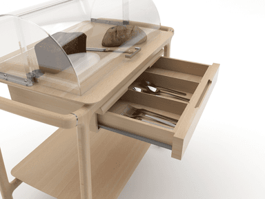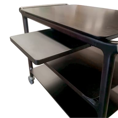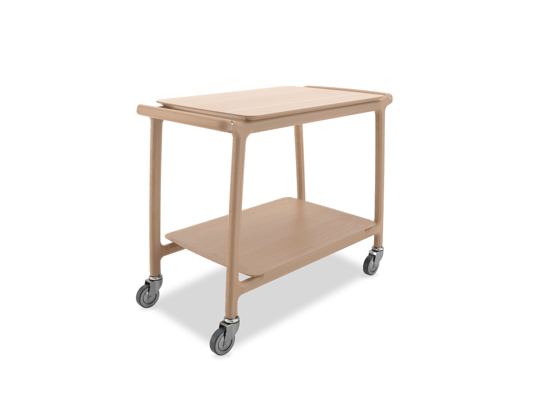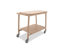 Carrito de madera maciza con 2 estantes y un diseño elegante y moderno. Adornado con pequeños detalles como detalles de metal en las manijas y contornos en los estantes. 4 ruedas giratorias de serie. Medida útil de los estantes 810x570 mm.