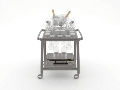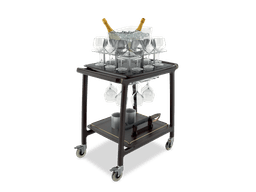 Carro de champán y burbujas con una importante presencia escénica en madera maciza. Estante revestido en laminado con decoración efecto mármol y equipado con soporte para vasos de plexiglás. Cubo para botellas central, dos glacettes en el piso inferior y repisas inferiores incluidas. A petición está disponible un escénico sable con soporte para la práctica del "sabrage" (Opt. SW). Dos ruedas con freno de serie.