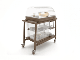 Carro multiuso equipado con 2 vitrinas refrigeradas independientes para el servicio de alimentos muy diferentes entre sí. La vitrina superior con cúpula semiesférica de doble apertura, es extraíble. La vitrina inferior completamente de Plexyglass para una presentación a 360°, ofrece 1 repisa intermedia neutra y una repisa inferior refrigerada. La refrigeración de ambos escaparates es a través de placas eutécticas para un servicio de hasta 5 horas. 2 Ruedas con freno de serie.