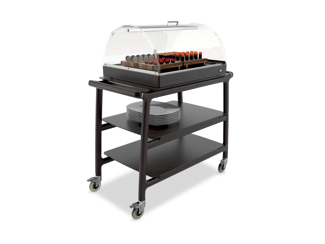 Carro de 3 estantes con escaparate refrigerado extraíble equipado con cúpula semiesférica de doble apertura. Refrigeración mediante placas eutécticas para un mantenimiento del frío hasta 5 horas de servicio.