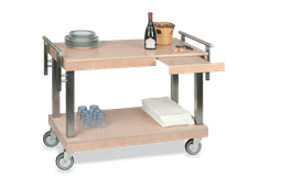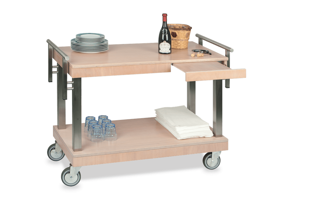 Carrito de servicio en acero inoxidable y madera maciza con línea moderna y cuadrada; disponible en 3 colores de serie, otros colores bajo pedido. Plataforma extraíble y 4 ruedas giratorias Ø 125 mm incluidas.
