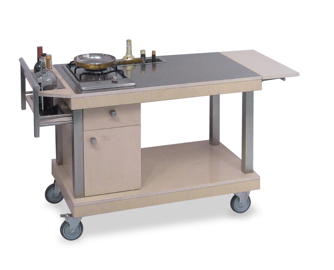 Carro flambeado en madera maciza con 1 fuego, equipado con cajón de servicio y compartimiento para botellas. Tapa revestida en acero inoxidable. Funcionamiento con bombona de gas butano o propano (no incluida). 2 ruedas con freno incluidas.