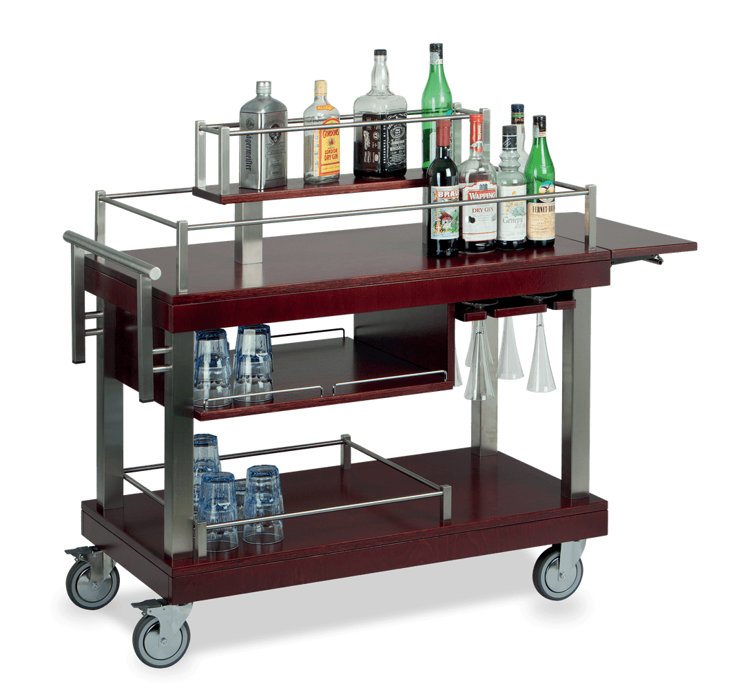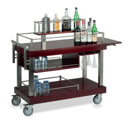 Carrito licor con estructura de acero inoxidable y encimeras de madera maciza. El piso superior está equipado con un panel central para la máxima exposición de las botellas que están contenidas en agradables rieles de contención. Lateralmente está disponible de serie un tablero plegable. La parte inferior está equipada con estantes para vasos y compartimentos de almacenamiento con rieles de retención. Dos ruedas con freno Ø 125 mm de serie.