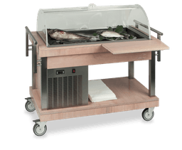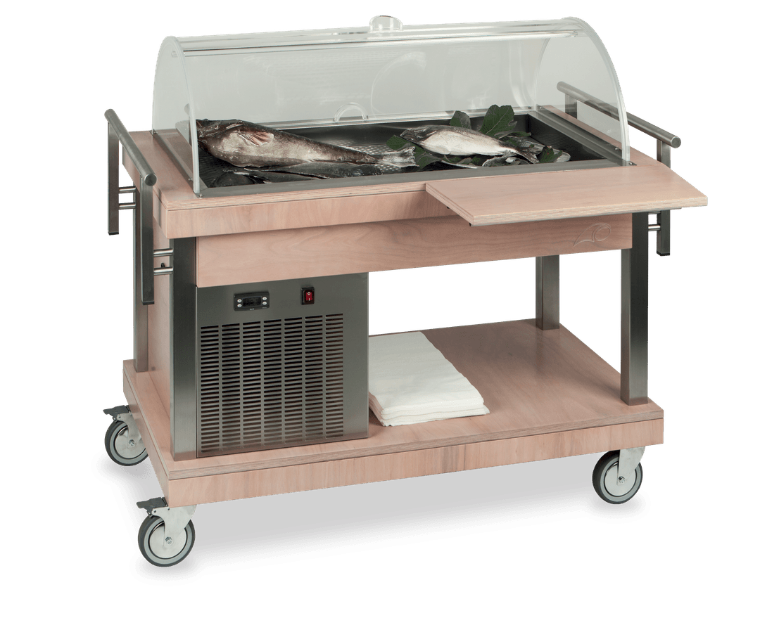 Carro refrigerado de madera maciza equipado con cúpula semisférica en plexiglás de doble apertura. Bañera de acero inoxidable profunda 16cm con grifo de descarga. Refrigeración mediante grupo compresor con gas R290 regulado por un termostato electrónico (+2°/+8°). Para el porcionado de los alimentos, la carretilla está equipada de serie con una plataforma portaplatos plegable. Ruedas Ø125mm, 2 de ellas con freno.