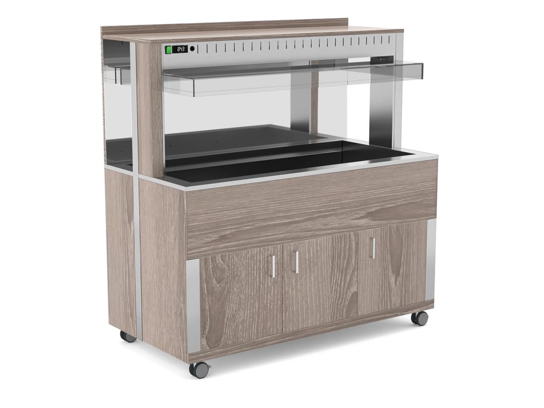 Buffet climatizado con estructura de madera laminada y espejo trasero para aumentar la profundidad visual y ofrecer un piso superior más amplio. Capacidad de módulos: 3-4-5-6 GN 1/1 según el modelo. Tapa superior en Plexiglass® fija. Modelos con calefacción por baño de agua. Para evitar que se empañe la parte inferior del espejo en el módulo BM, se recomienda el uso de tapas en los depósitos GN. Algunas variantes están equipadas con lámparas halógenas para una calefacción incluso desde arriba. Iluminación led y dos ruedas de poliamida con freno de serie. Tanques GN no incluidos.