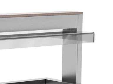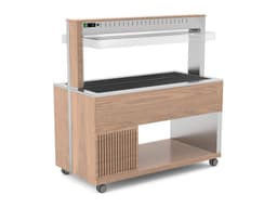 Buffet con refrigeración estática con estructura de madera laminada. Para una elegante continuidad visual, las rejillas de ventilación del grupo compresor se encuentran directamente en la estructura de madera.