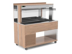 Buffet refrigerado con estructura de madera laminada y espejo trasero para aumentar la profundidad visual y ofrecer un piso superior más amplio. Para una continuidad estética, las rejillas de ventilación del grupo compresor se taladran directamente en la estructura de madera. Capacidad de módulos: 3-4-5-6 GN 1/1 según el modelo. Tapa superior en Plexiglass® fija o abatible eléctricamente (Athena /M). Módulo con refrigeración estática. Termostato digital (+2°/+8°) e iluminación led. Dos ruedas de poliamida con freno de serie. Tanques GN no incluidos.