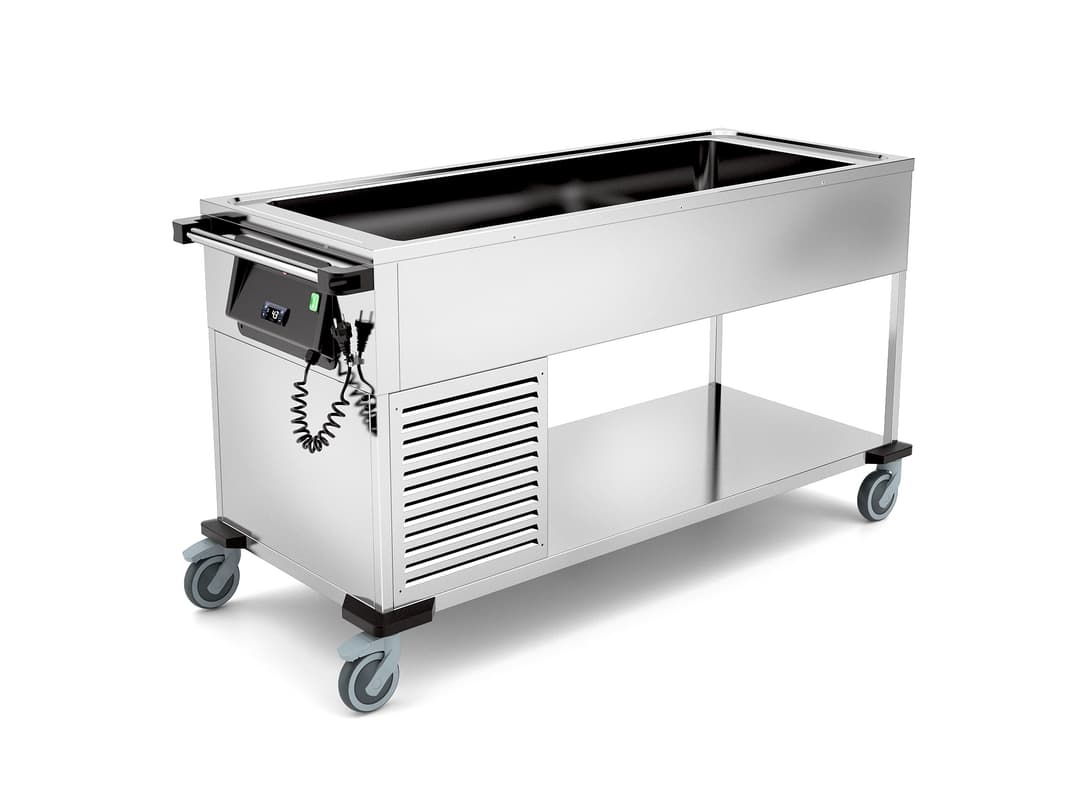 Carro en acero inoxidable AISI 304 con bañera única moldeada y esquinas redondeadas capacidad 2 o 3 GN 1/1 h200mm (cubas GN no incluidas). Equipado con aislamiento de doble pared y grifo de descarga. Panel de mandos ergonómico orientado hacia el operador y extraíble para un fácil mantenimiento completo de interruptor luminoso y termostato digital. Equipado con mango de empuje aislado con soportes de plástico y gancho cómodo para el cable en espiral cuando no está en uso. Cada carro tiene 4 protectores de esquina antihuellas y 2 ruedas con freno de serie.