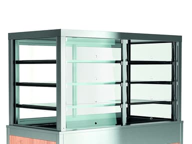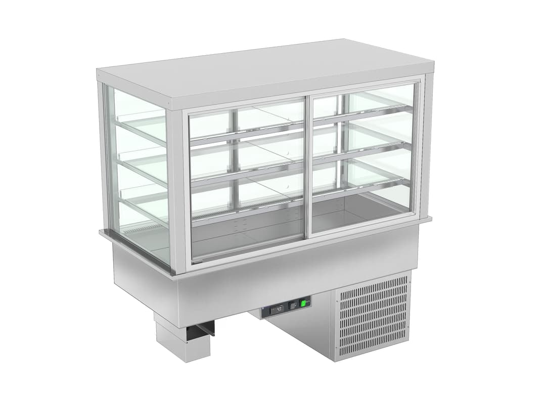 Vitrina refrigerada por empotrar dim. 4GN1/1. Refrigeración ventilada con distribución del frío; la temperatura es regulada por un termostato electrónico. La bañera está equipada de serie con un fondo regulable en altura para permitir la mejor exposición de botellas y alimentos. 3 Encimeras de vidrio templado iluminadas por 2 barras led verticales que garantizan una iluminación uniforme. El frente público puede estar equipado con flaps frontales en Plexyglass para reducir la dispersión del frío o completamente cerrado por vidrios atermicos de doble cámara. En el lado del operador hay puertas correderas de doble acristalamiento con cierre automático. Equipado con bandeja auto-evaporante para la gestión del condensado.