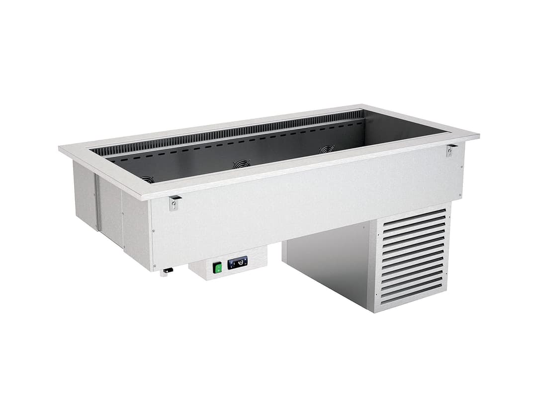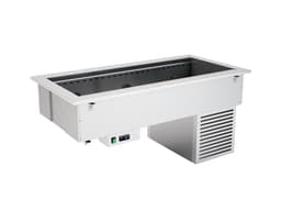 Drop-in de refrigeración ventilada gracias a un grupo compresor con gas R290. Bañera de acero inoxidable profunda 26cm con esquinas redondeadas y grifo de descarga, la temperatura se regula mediante termostato electrónico. La refrigeración es "en seco", ventilada mediante ventiladores colocados en un tanque sin evaporador. Capacidad 3-4-5 GN 1/1. Tanques GN no incluidos. Disponible también en versión sin unidad refrigerante y predispuestos para conexión remota (/REM).