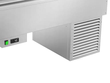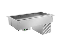 Drop-in de refrigeración ventilada con evaporador. El tanque está equipado con boquillas que crean una cortina de aire que mejora la eficiencia del refrigerante optimizando los consumos. Fondo regulable en altura para permitir la inserción de depósitos GN (no incluidos) de hasta 100 mm. Los paneles de la parte inferior son extraíbles para simplificar las operaciones de limpieza y mantenimiento. Disponible también en versión sin unidad refrigerante y predispuestos para conexión remota (/REM).
