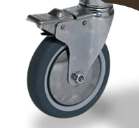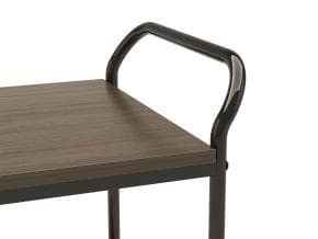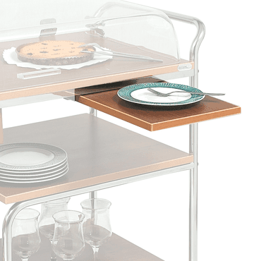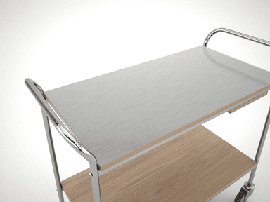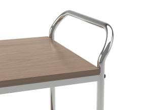 Carrito para el servicio de sala de 2 pisos con estructura en tubo redondo cromado y estantes de madera laminada con una amplia gama de decoraciones. 4 Parachoques antihuella y 4 ruedas giratorias Ø100mm de serie. Estructura en tubo redondo cromado o níquel negro.
