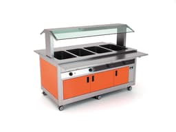 Bufé climatizado con baño de agua y bañeras separadas, para uso en escuelas o hoteles familiares. Con patas regulables en altura con zócalo. La bañera es de acero inoxidable, profundo 26cm con esquinas redondeadas, grifo de descarga y calentado por resistencias de silicona adhesivas. La temperatura de la bañera se regula mediante un termostato digital.