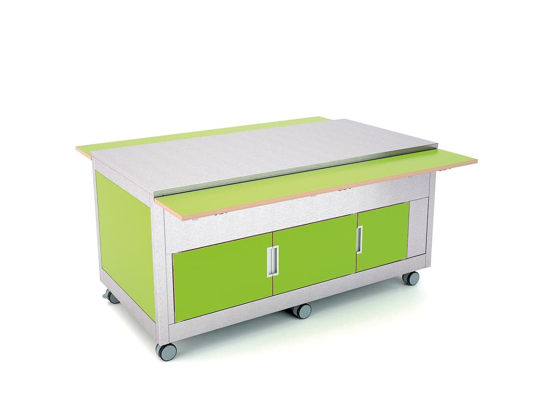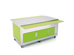 Buffet neutro para uso en escuelas o hoteles familiares. Estructura de acero inoxidable y paneles de madera laminada, los paneles también pueden ser de acero inoxidable (SST) y chapa barnizada (CST). Puede colocarse solo como isla o utilizarse en línea con otros módulos de Omnia para crear una línea de autoservicio.