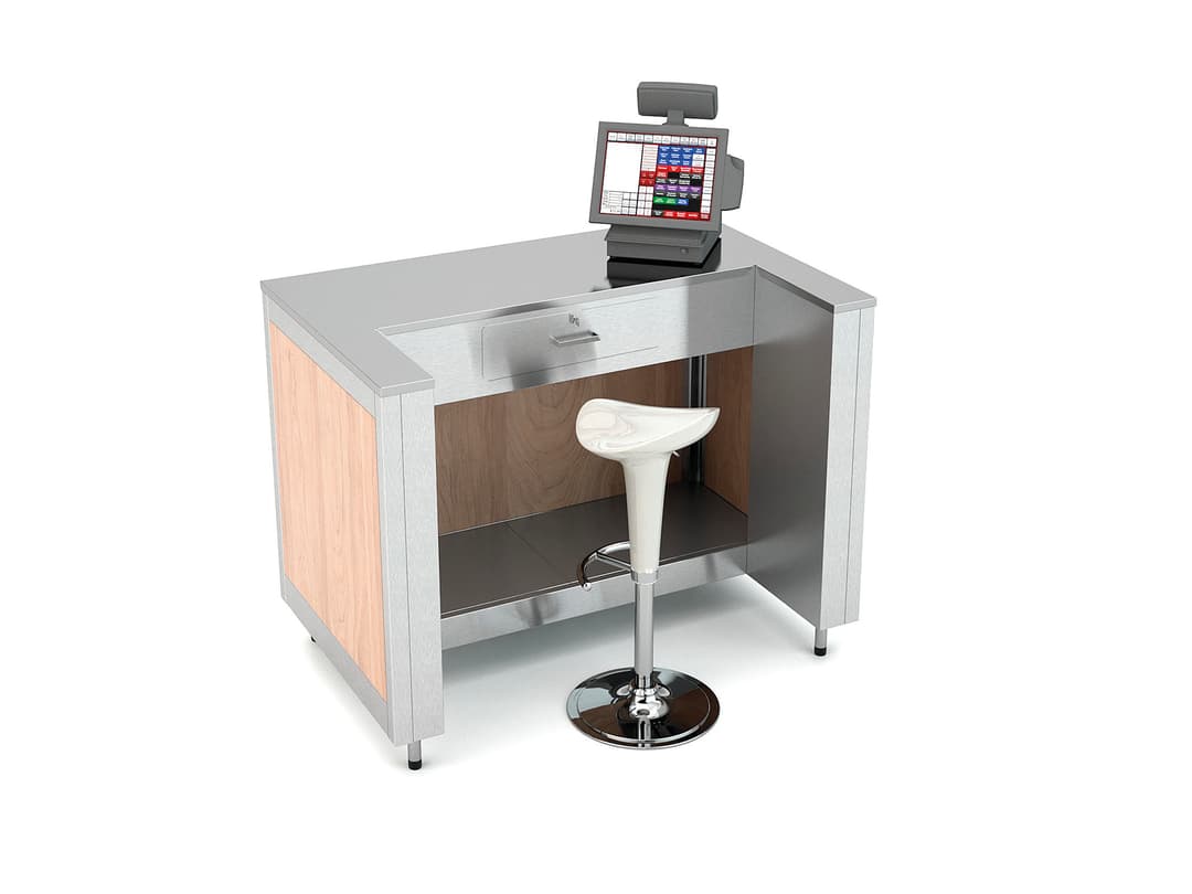 Módulo caja. Estructura en acero inoxidable y paneles de madera laminada estándar o con sobre-panel (SPP). Los paneles también están disponibles en acero inoxidable (SST) y chapa barnizada (CST). El módulo está equipado con un práctico cajón con cierre con llave. Equipado con patas ajustables en altura enmascarables con un zócalo.