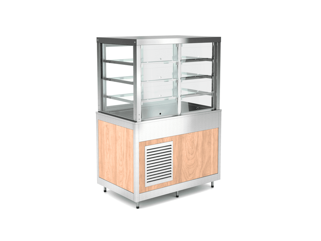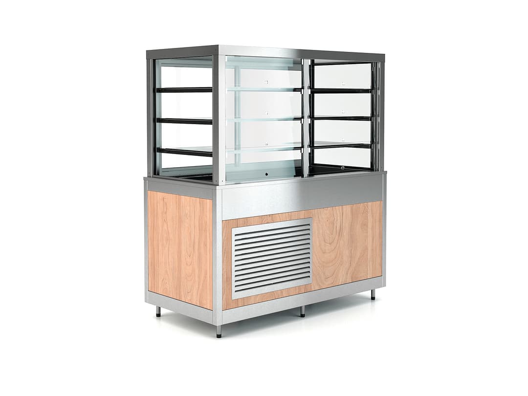Escaparate de exposición en 4 niveles con flaps delanteros y puertas traseras para la provisión. Refrigeración ventilada con evaporadores de descongelación automática, grupo compresor que funciona con gas R290.