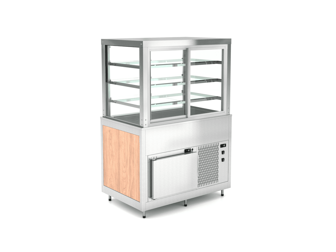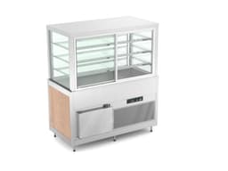 Vitrina de exposición refrigerada en vidrio doble cámara templado con compartimiento inferior refrigerado estáticamente. Estructura de acero inoxidable y paneles de madera laminada. Equipado con patas regulables en altura que se pueden enmascarar con un zócalo. La vitrina permite la máxima visibilidad de los alimentos expuestos en 3+1 niveles: en cada piso hay un práctico flap frontal en Plexyglass para el disfrute de los platos y que limita la dispersión del frío. Para el equipamiento de la vitrina se han previsto 2 cómodas puertas traseras equipadas con cámara de vidrio y sistema de cierre automático para una mayor eficiencia energética. Las puertas correderas también no crean obstáculos en el espacio de trabajo de los operadores. Depósito con fondo regulable en 3 alturas y totalmente desmontable para permitir su limpieza, equipado con recipiente de recuperación para agua de condensación, tamaño 3-4 GN 1/1. Refrigeración ventilada con evaporadores de descongelación automática, grupo compresor que funciona con gas R290. Iluminación led vertical de serie. Disponible en la variante con aletas frontales o con cristales fijos en el frente público (FX). El compartimiento inferior está equipado con un compartimento refrigerado con cierre a presión. Temperatura regulada por termostato digital independiente del de la bañera.