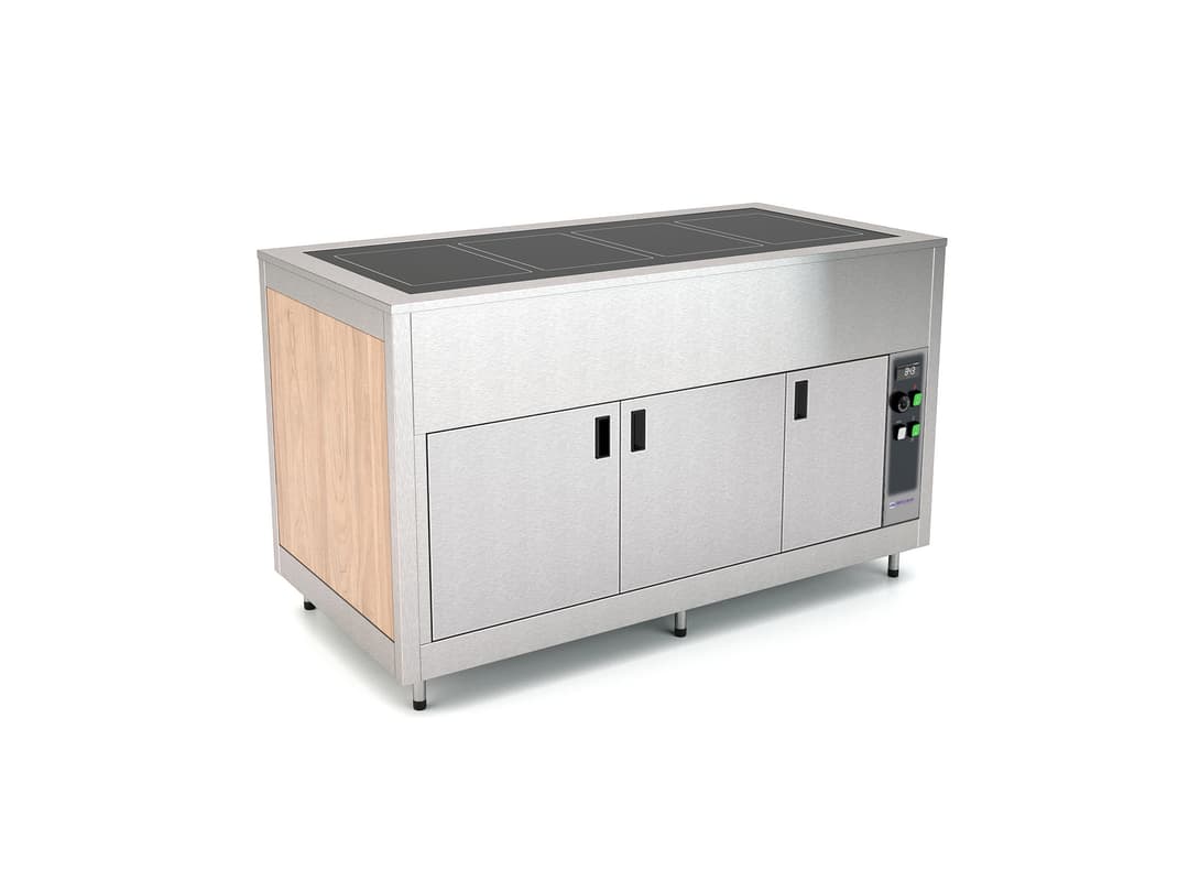 Buffet con tapa caliente de vidrio templado con compartimento inferior calentado, estructura en acero inoxidable y paneles de madera laminada, también disponible en acero inoxidable (SST) y chapa pintada (CST). Pies regulables en altura con zócalo. La temperatura es regulada por un termostato digital. No se trata de una mesa de inducción. Cada módulo se puede completar con diferentes tipos de iluminación, mamparos y muchas otras opciones.