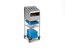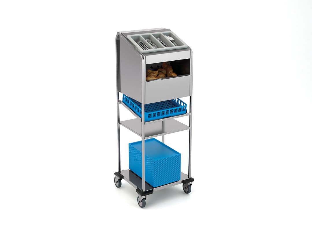 Módulo portabandejas, vasos y cubiertos para completar la línea de autoservicio.