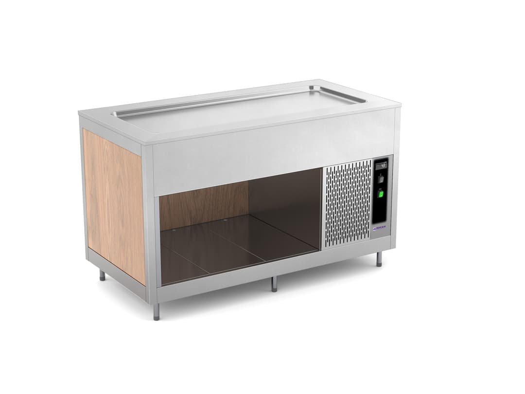 Buffet refrigerado con tapa de acero inoxidable impreso y con bordes redondeados para facilitar la limpieza. Plano profundo 30 mm y equipado con grifo de descarga. Equipado con pies ajustables en altura enmascarables con un zócalo. Refrigeración estática alimentada por un grupo compresor que funciona con gas R290. La temperatura de la encimera está regulada por un termostato digital.