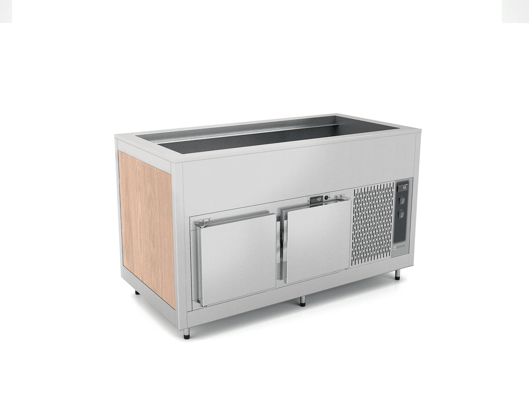 Buffet refrigerado estáticamente con compartimento inferior refrigerado. La bañera y el compartimiento inferior están equipados con refrigeración independiente gracias a 2 compresores separados y regulados por 2 termostatos electrónicos. Las unidades de refrigeración son alimentadas por gas R290. Tanque de acero inoxidable profundo 26cm con esquinas redondeadas y grifo de descarga. El aparador tiene una estructura de acero inoxidable y paneles de madera laminada estándar o con sobrepanelado (SPP). Los paneles también están disponibles en acero inoxidable (SST) y chapa barnizada (CST). Equipado con patas ajustables en altura enmascarables con un zócalo. El aparador se puede completar con diferentes tipos de iluminación, mamparas y muchas otras opciones.