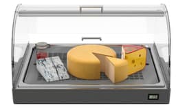 Escaparate de exhibición para aperitivos, postres y quesos con cúpula en Plexyglass semiesférica de doble apertura. Estructura revestida de acero inoxidable en madera maciza con tapa interior de acero inoxidable. Refrigeración mediante 2 placas eutécticas (incluidas) que permiten una liberación del frío de hasta 5 horas. Disponibles juegos de placas adicionales para un uso prolongado. La vitrina está equipada con un termómetro para consultar rápidamente la temperatura dentro de la vitrina. Tamaño útil de la rejilla de acero inoxidable perforada: 616x492 mm.