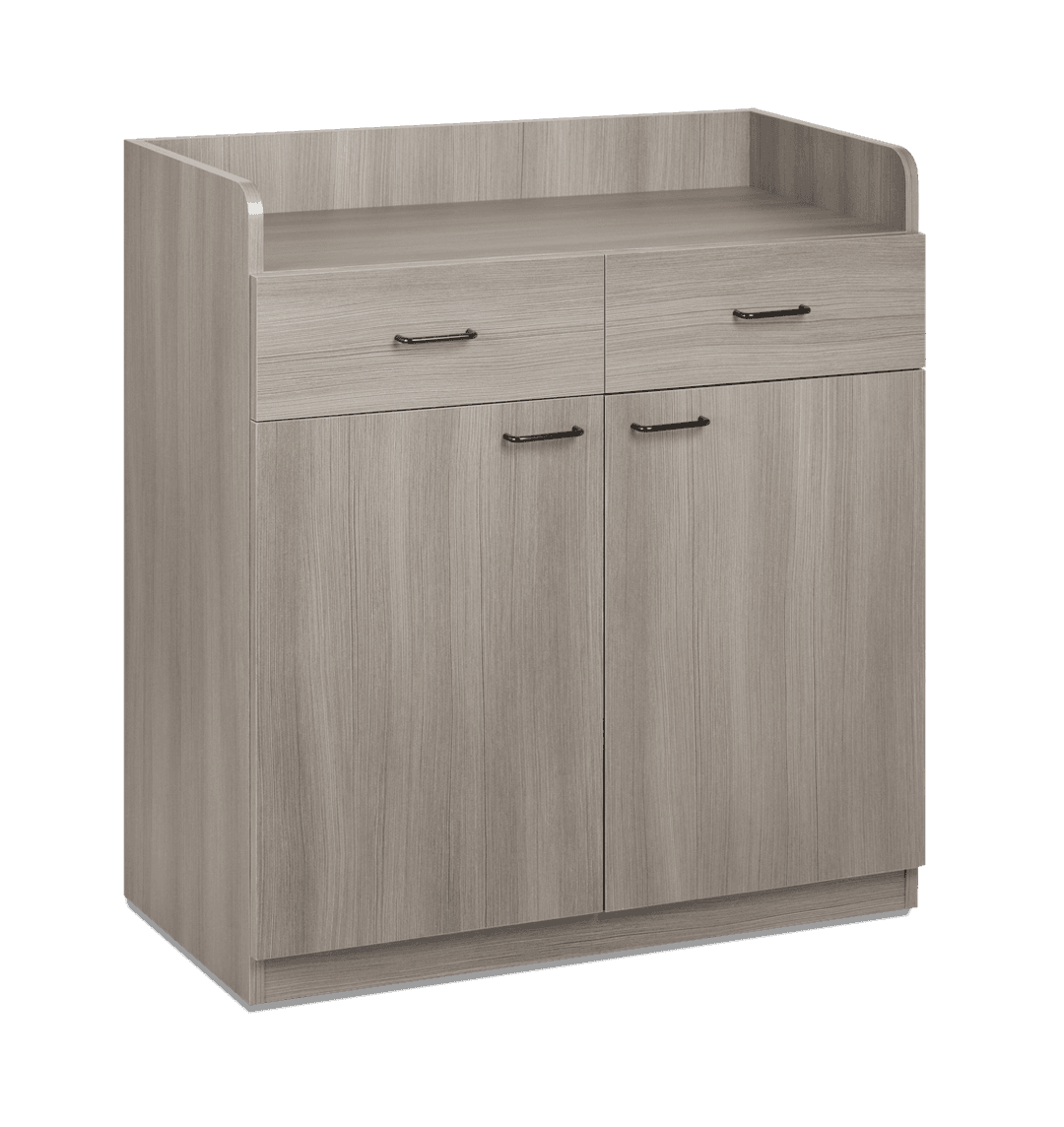 Muebles de servicio sobre ruedas hechos de madera laminada. Equipado con dos cajones con divisores internos para cubiertos, dos puertas con cierre lento, con estante interno regulable en altura y dos estantes superiores, uno de los cuales es regulable en altura. En lugar de los cajones, se puede solicitar un portacubiertos abierto con 6 compartimentos (opción PP/F). Los muebles se pueden equipar con una base reforzada con ruedas más grandes (ø125mm) y manija de empuje (B/R).