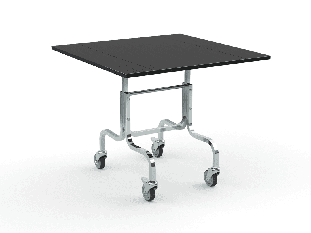 Mesa para el servicio de habitaciones con tapa abatible, apilable cuando no está en uso. Equipado con 2 aletas plegables para cruzar puertas y ascensores. Superficie de trabajo cuadrada en madera laminada hidrofóbica de 91x91 cm y borde antichoque en ABS. Estructura en tubo cromado. Equipado con 4 ruedas antihuellas de alta calidad, 2 de ellas con freno, Ø 10 cm.