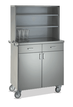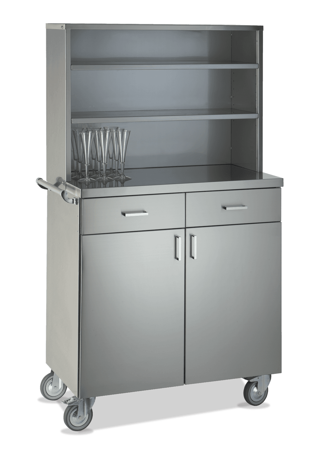 Muebles de servicio sobre ruedas hechos de madera laminada. Equipado con dos cajones con divisores internos para cubiertos, dos puertas con cierre lento, con estante interno regulable en altura y dos estantes superiores, uno de los cuales es regulable en altura. En lugar de los cajones, se puede solicitar un portacubiertos abierto con 6 compartimentos (opción PP/F). Los muebles se pueden equipar con una base reforzada con ruedas más grandes (ø125mm) y manija de empuje (B/R).