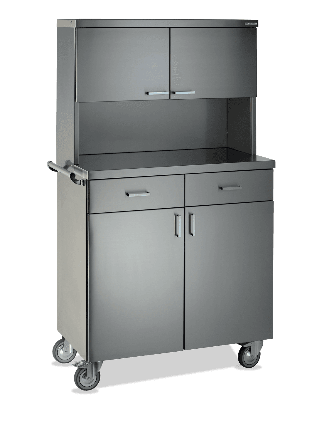Muebles de servicio sobre ruedas hechos de madera laminada. Equipado con dos cajones con divisores internos para cubiertos, dos puertas con cierre lento, con estante interno regulable en altura y dos estantes superiores, uno de los cuales es regulable en altura. En lugar de los cajones, se puede solicitar un portacubiertos abierto con 6 compartimentos (opción PP/F). Los muebles se pueden equipar con una base reforzada con ruedas más grandes (ø125mm) y manija de empuje (B/R).
