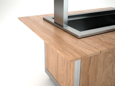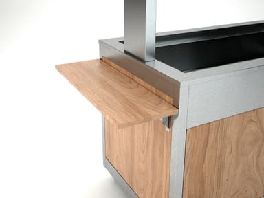Escaparate refrigerado con estructura de madera laminada para la presentación de pescado o dulces-quesos-antipasti. Bañera de 18 cm de profundidad y equipada con grifo de descarga. La bañera está protegida por una cúpula en Plexyglass semiesférica de doble apertura.