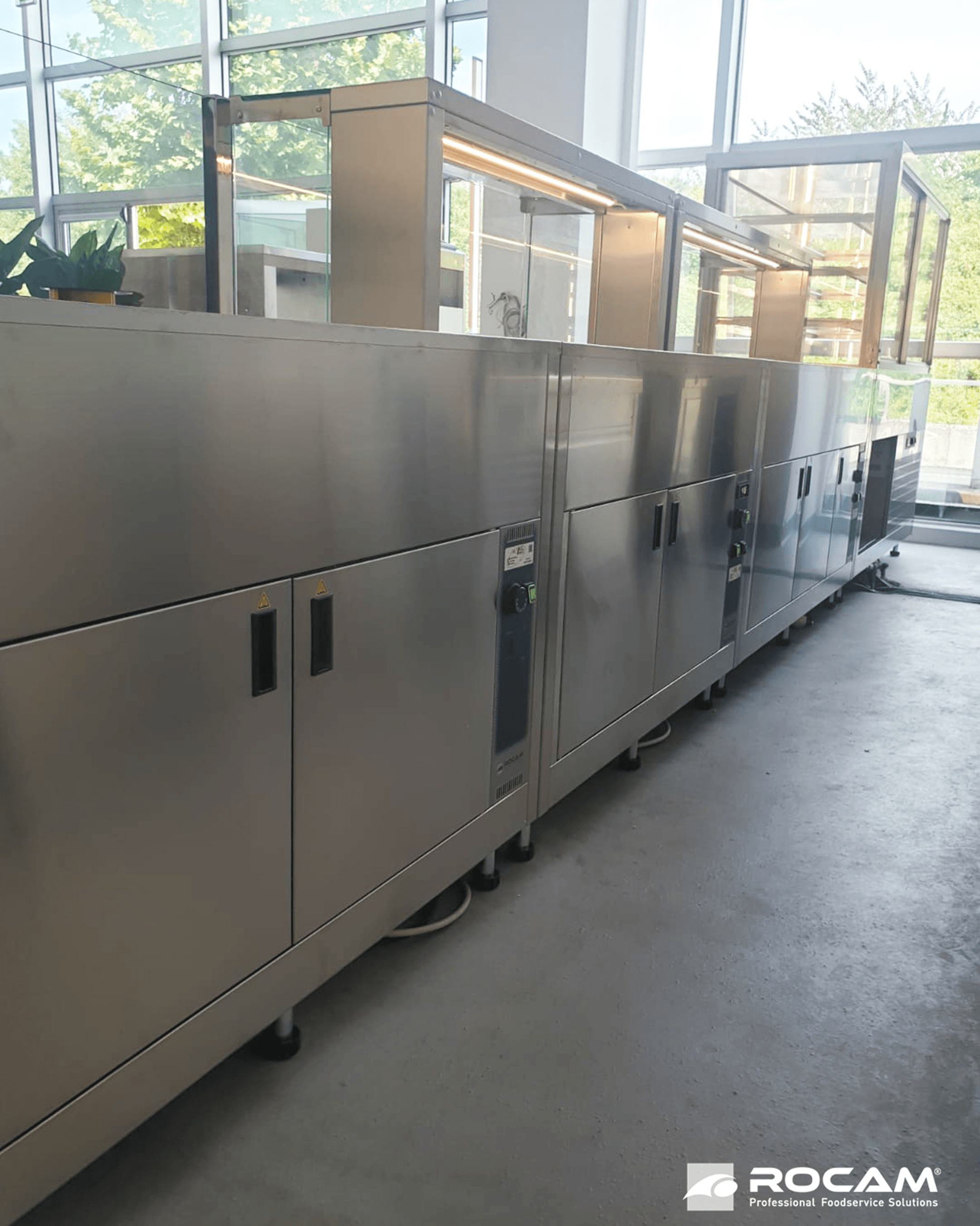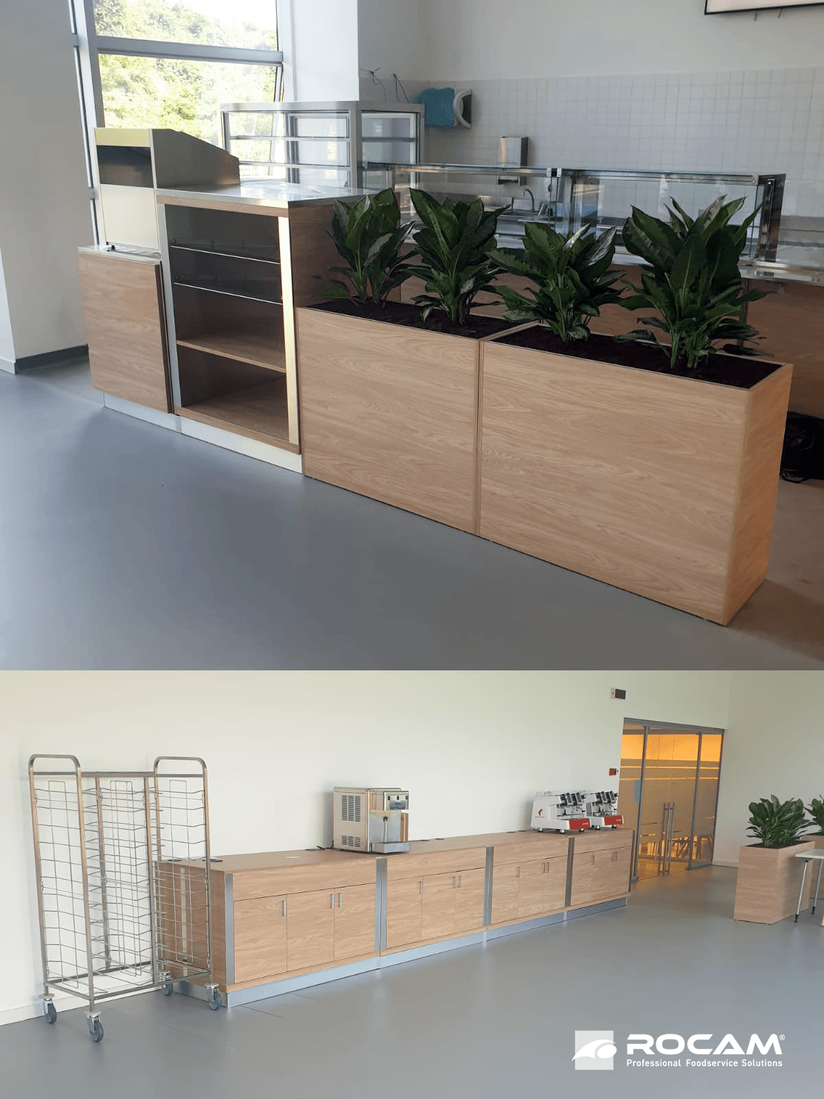 Nueva cafetería de la empresa terminada en el Véneto y nuestra línea OMNIA está en el centro de ella. El sobrepannellato color olmo y los deslizamientos de bandejas en acero inoxidable, le dan al conjunto la misma elegancia de una línea custom made, sin sacrificar la practicidad de una línea modular. Completan el ambiente de las hermosas jardineras hechas a medida en madera laminada, con bañera de acero inoxidable para dar cabida a las plantas.