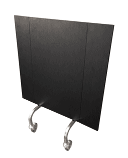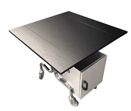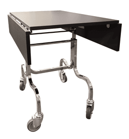 Table pour le service de chambre avec plateau rabattable, empilable lorsqu’il n’est pas utilisé. Équipé de 2 volets pliables pour traverser les portes et les ascenseurs. Plan de travail carré en bois stratifié hydrofuge de 91x91 cm et bord antichoc en ABS. Structure en tube chromé. Equipé de 4 roues antitraces de haute qualité et 2 roues avec frein, Ø 10 cm.
