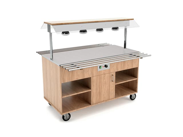 I modelli HEKO sono interamente realizzati in legno laminato idrofugo e sono dotati di serie di alzatine con illuminazione LED e parafiato fisso in plexiglass, di scorri vassoi o appoggia piatti ribaltabili frontali e posteriori e di grandi ruote diam.125mm per una facile e comoda movimentazione. Numerosi optional sono disponibili quali chiusura vano inferiore, spondine di protezione superiore o differenti tipologie di ribaltine scorri vassoi in tubo o acciaio inox.