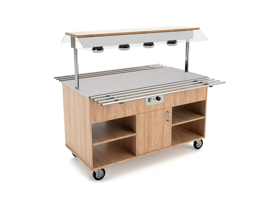 Buffet riscaldati con struttura in legno laminato e dettagli in acciaio inox, capacità 3-4-5-6 GN1/1. Calotta superiore fissa in Plexyglass® e portapiatti pieghevoli fronte/retro in legno di serie. Piano liscio in acciaio inox AISI 304 riscaldato tramite resistenze poste sotto il piano stesso. Lampade a infrarossi poste sull'alzata inclusa offrono un ulteriore fonte riscaldante. Ruote Ø125 mm di cui 2 con freno incluse.