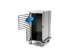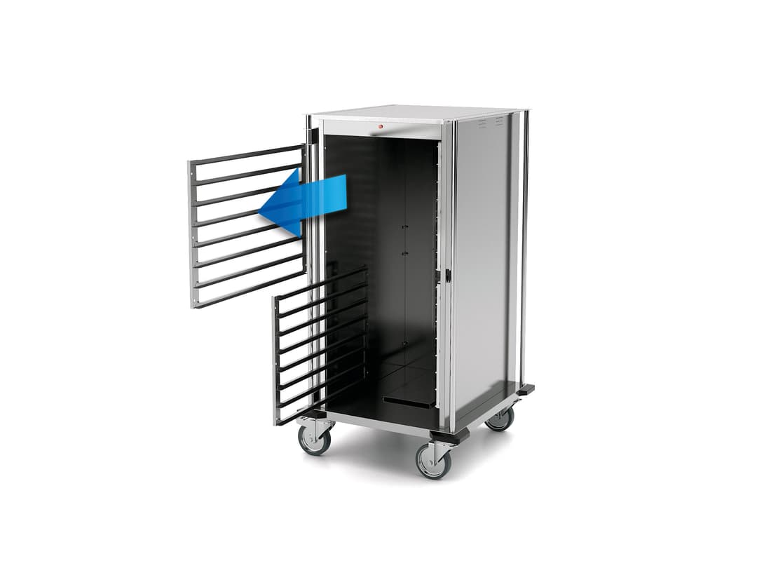 Costruzione a parete doppia coibentata, ogni carrello è dotato di 2 pratici tubi di spinta a tutt’altezza e gli sportelli sono dotati di guarnizione a tenuta termica. Di serie ogni modello ha 4 paracolpi angolari anti-traccia e 4 ruote girevoli Ø125 mm di cui 2 con freno. I carrelli internamente hanno delle guide di sostegno a “C” anti-ribaltamento per vasche GN. Questi telai sono rimuovibili per facilitare il loro lavaggio e la pulizia del vano interno.